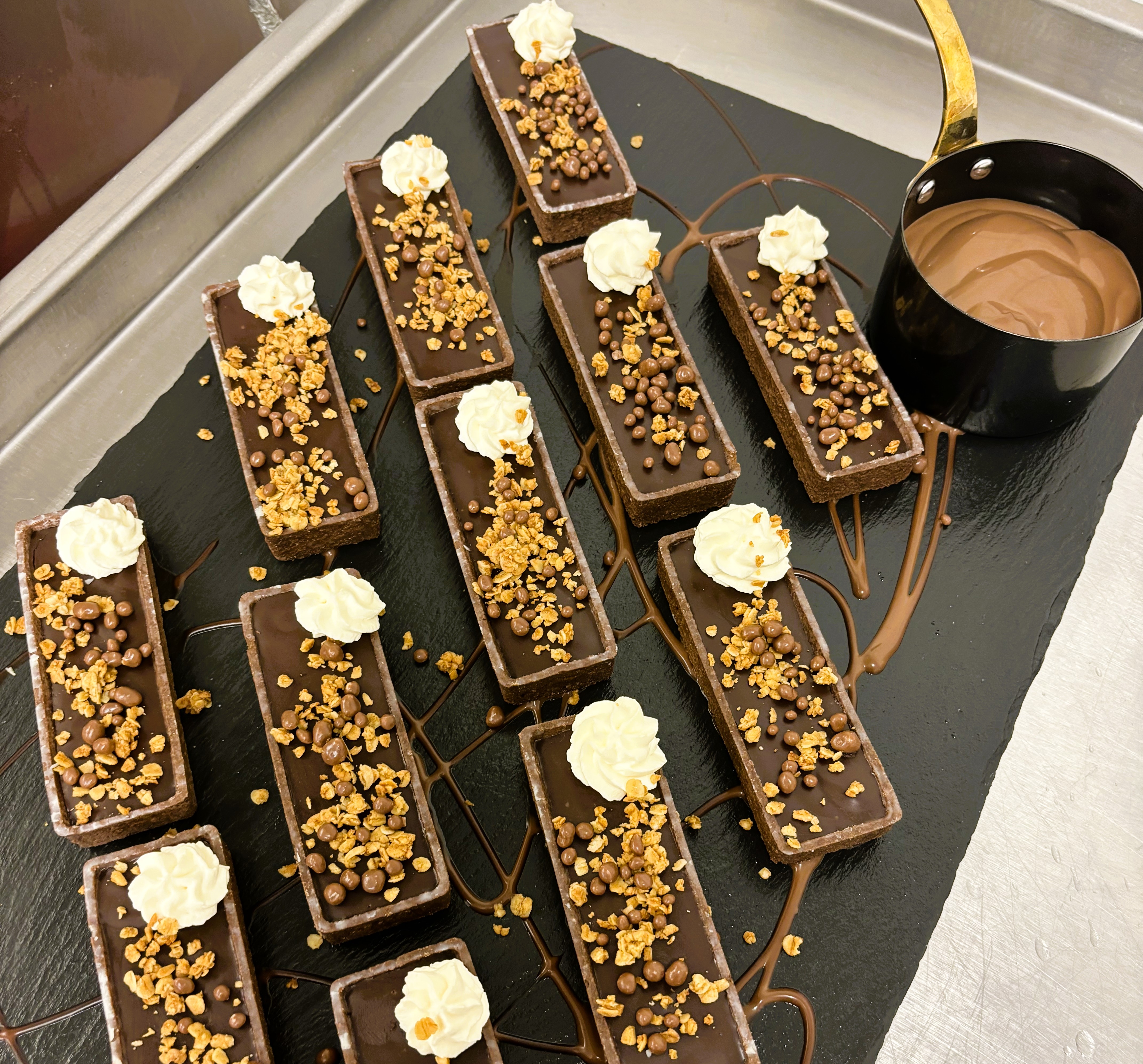 Chocolate and Caramel Torte served with a rich chocolate sauce and Popping Candy