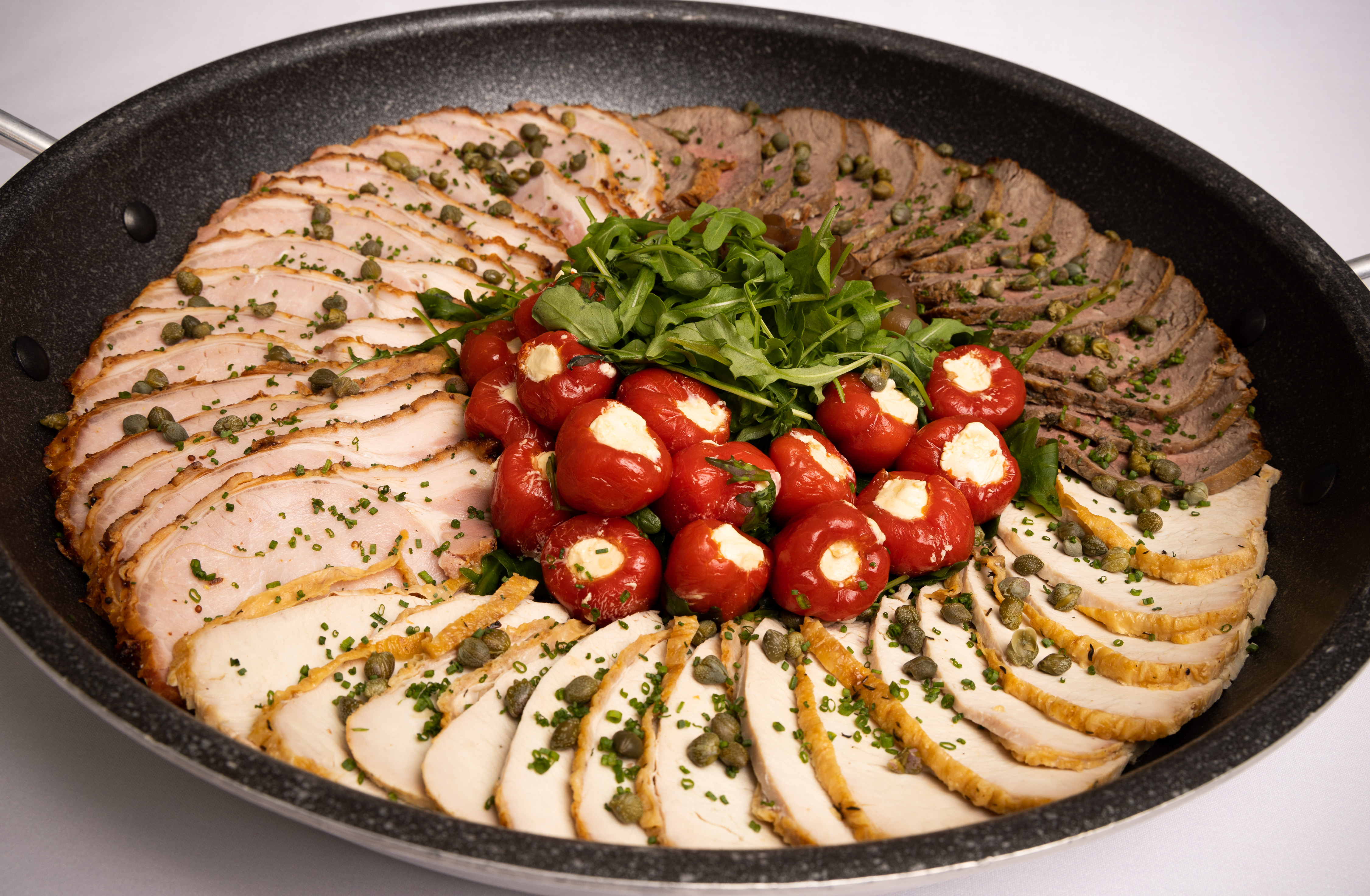 Antipasti selection of cured meats, gherkins, rocket and parmesan salad, stuffed peppers, new potato and red onion horseradish mayo, asian style slaw, moroccan couscous, caramelised red onion and pant y gawn quiche, chicken goujons, mini cheesecakes with fruit compote and chocolate sauce, blueberry brownies.