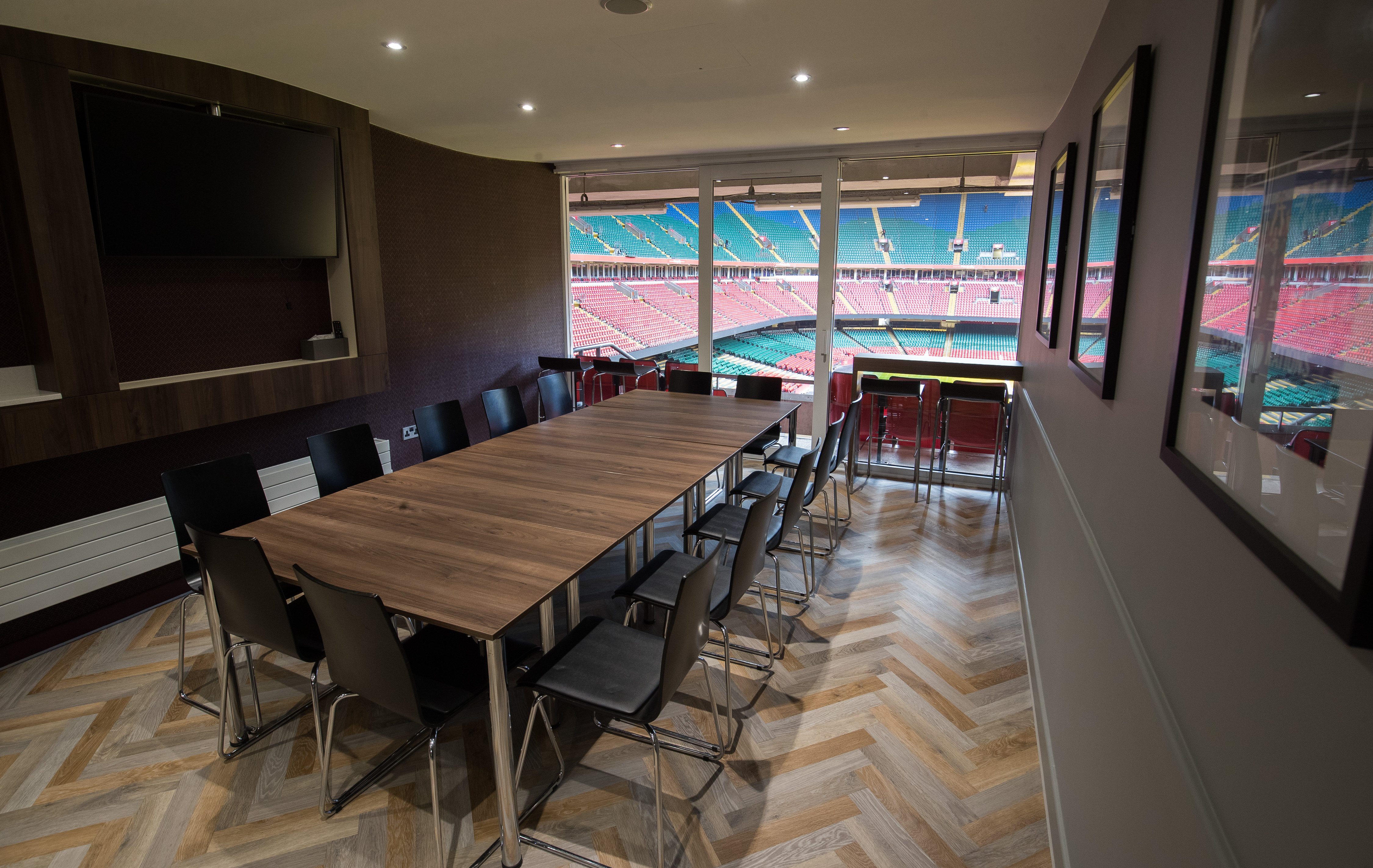 Principality Stadium is home to 113 executive private suites. All of our executive suites overlook the iconic rugby pitch, and are fitted with TVs that can be connected to via screen mirroring or a HDMI cable. A single executive suite can hold around 12 guests.